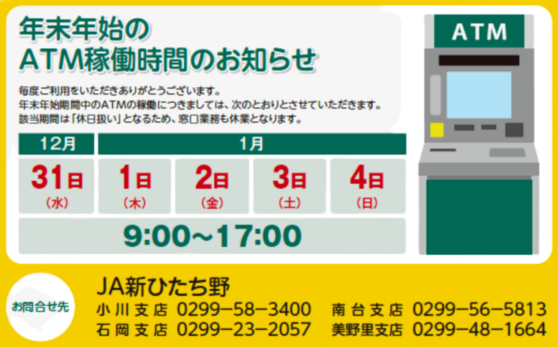 以下の期間は「休日扱い」となり、ATMは下記の時間帯で稼働いたします。また、窓口業務につきましては休業となります。